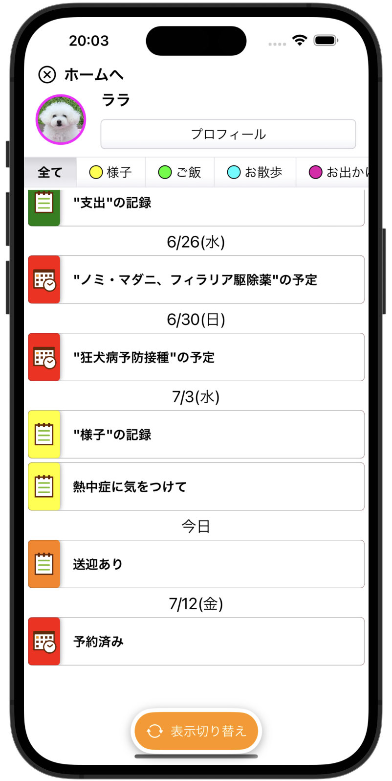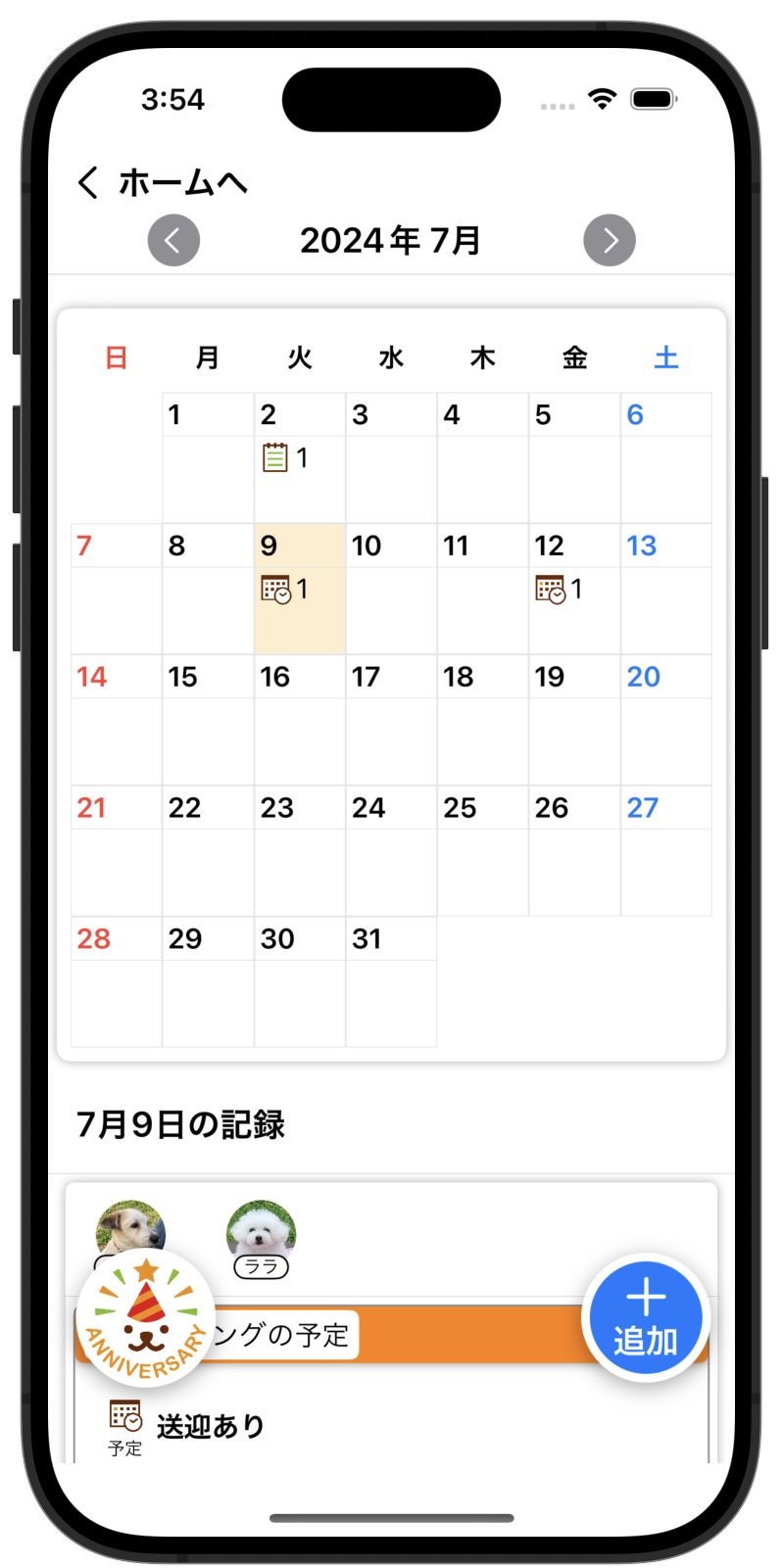 カレンダー表示やペットごとの一覧表示でしっかり管理。リマインダー機能で予定も忘れずにチェック。